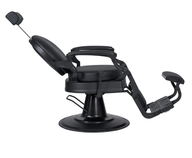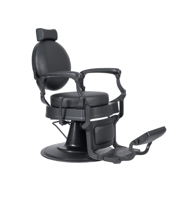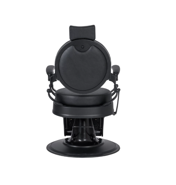 Εκλεπτυσμένη καρέκλα κουρείου με πλαίσιο πλήρους έγχυσης αλουμινίου σε μαύρο ματ φινίρισμα. Στρογγυλή και στιβαρή μαύρη βάση που ταιριάζει με τη δομή της καρέκλας. Υδραυλική αντλία για ρύθμιση ύψους και λειτουργία κλειδώματος. Εργονομική κυκλική πλάτη και κάθισμα σε στυλ vintage. Αναστρέψιμο υποπόδιο. Επενδυμένο σε μαύρο χρώμα